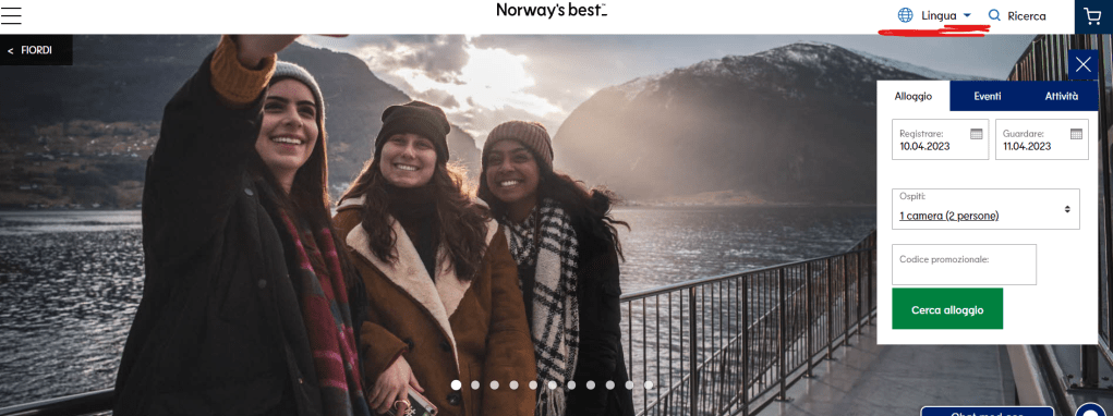 Per iniziare clicca link Norway’s Best. Una volta cliccato sul link, ti si aprirà il sito web. In alto a destra, vedi immagine, digita la lingua che preferisci.