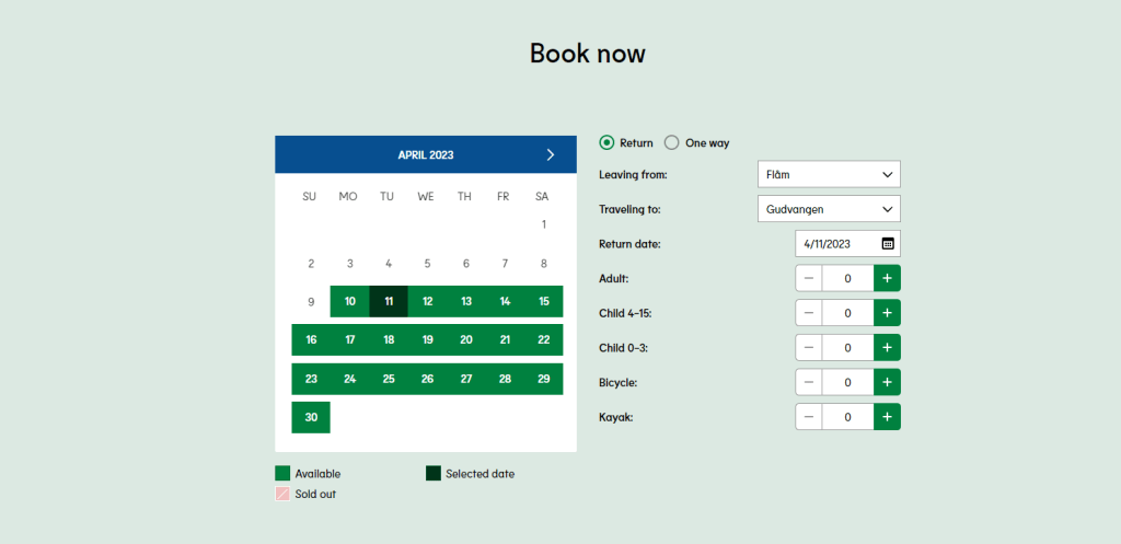 Una volta scelta la tratta da Gudvangen – Flåm , oppure, viaggio di andata e ritorno Flåm – Gudvangen – Flåm, inserisci il numero di persone, uno, due, tre ecc, se hai bambini compila i riquadri e poi premi “Next”.
