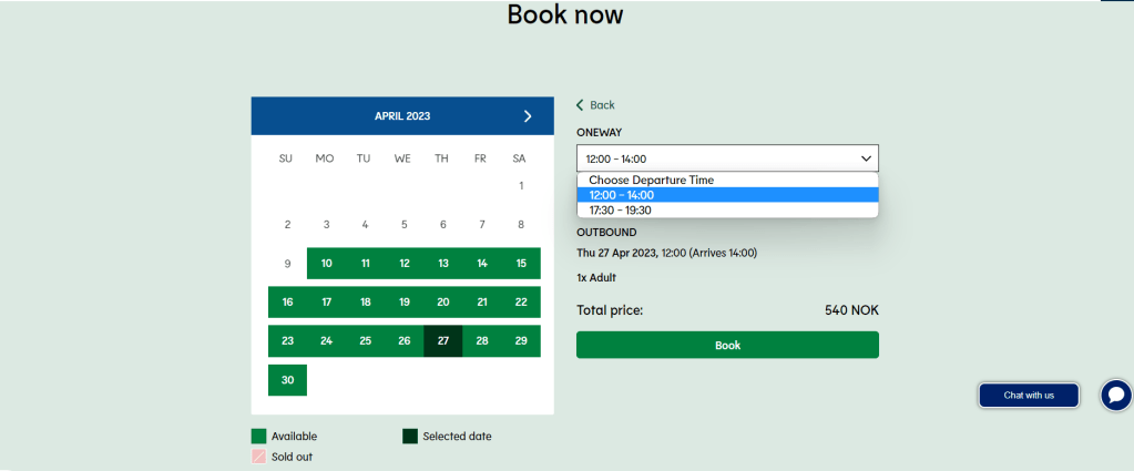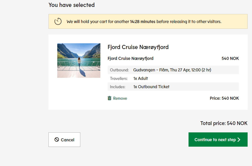 Prosegui cliccando sul pulsante “Book”, ti si aprirà una pagina con il dettaglio del tuo tour e il prezzo finale. Noi in questo caso abbiamo fatto il viaggio da Gudvangen a Flåm.