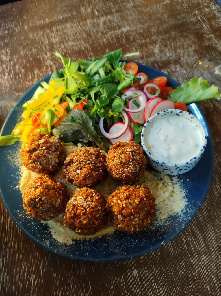 Il piatto viene servito con sei grandi falafel ben cotte adagiate su un letto di humus e accompagnate da una ricca insalata e della salsa allo yogurt. Ben impiattato e molto colorato, questo piatto, oltre a mettere allegria, mangiandolo, delizia dolcemente il palato con un mix di sapori unici e non troppo saporiti.