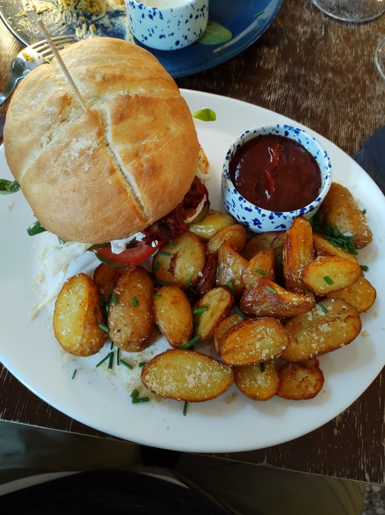 Il terzo piatto che abbiamo assaggiato è il jackfruit “cheeseburger” accompagnato con delle deliziose patate al forno e ketchup. Il panino, molto grande e ben farcito, ha un sapore veramente eccezionale. Sicuramente questo è uno dei piatti forti del locale.