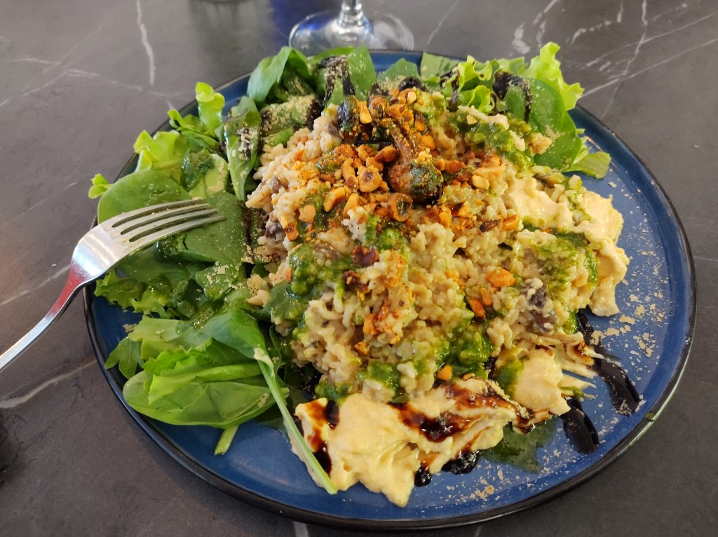 Parliamo ora del risotto ai funghi, questo secondo noi è veramente un piatto eccezionale. Non aspettarti il solito risotto, ne rimarresti deluso ma, se lo provi, sicuramente le tue papille gustative potrebbero fare dei veri salti di gioia. Abbondante e ben cotto, il risotto viene servito con funghi, pistacchi, insalata e humus. Un piatto che veramente merita le cinque stelle.