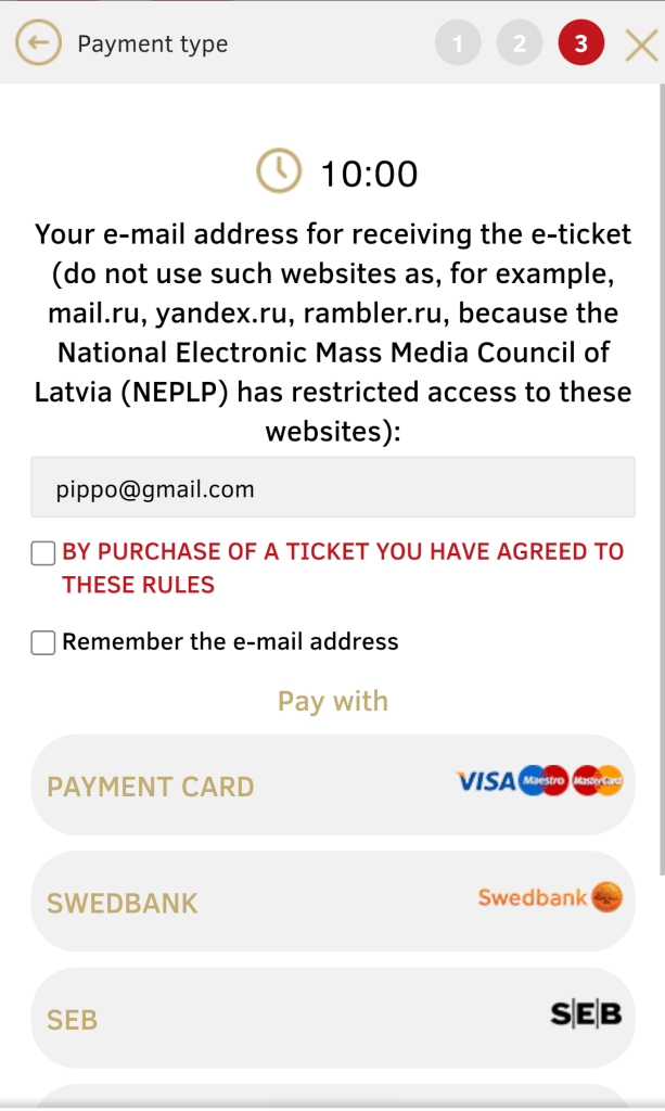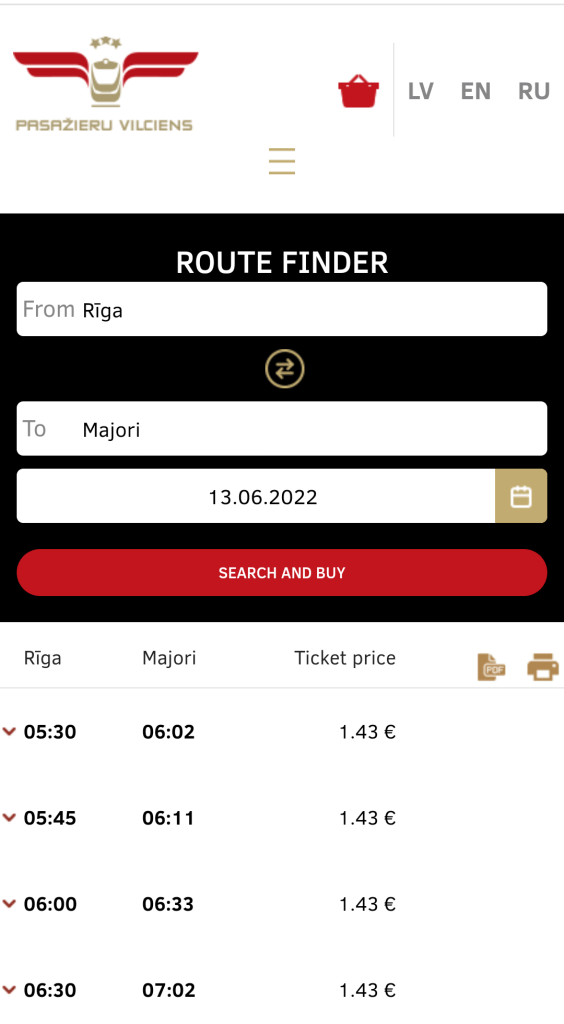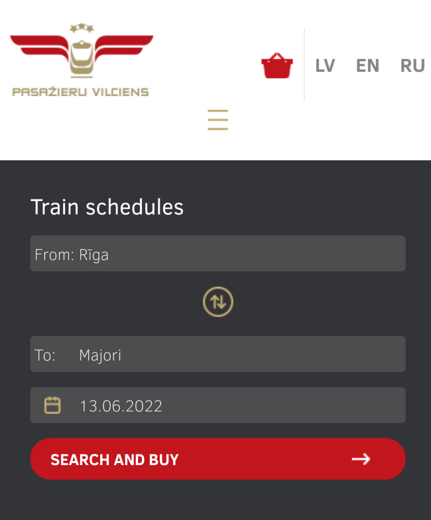 Nel primo riquadro inserisci Riga, nel secondo la stazione di destinazione (Majori) e nel terzo la data della gita. Compilati i tre spazi, digita su Search and buy.