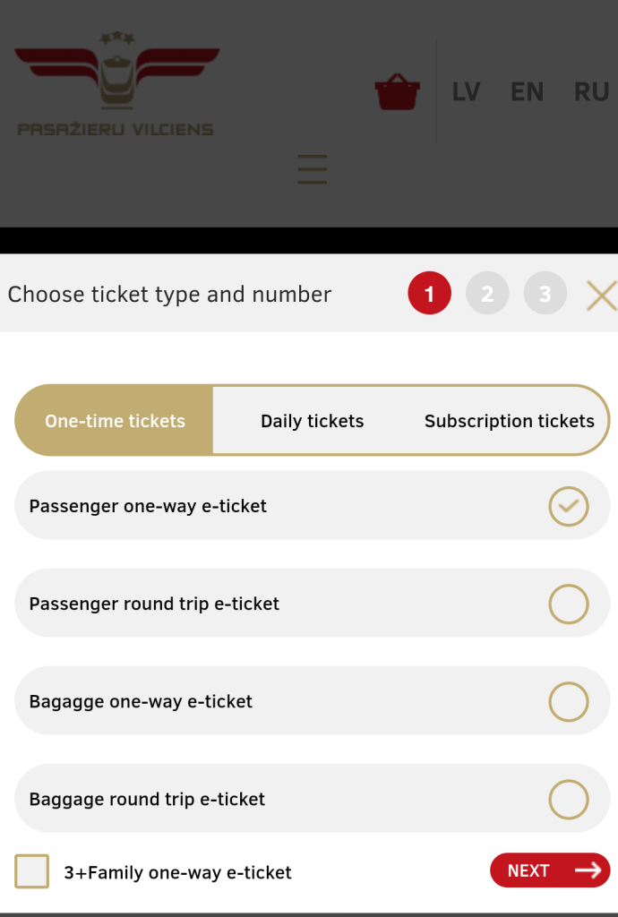 Una volta selezionato il biglietto, ti si aprirà una nuova finestra dove dovrai selezionare One-time tickets, prosegui mettendo la spunta su passenger one way e ticket (biglietto elettronico di sola andata per i passeggeri) e premi il tasto next.