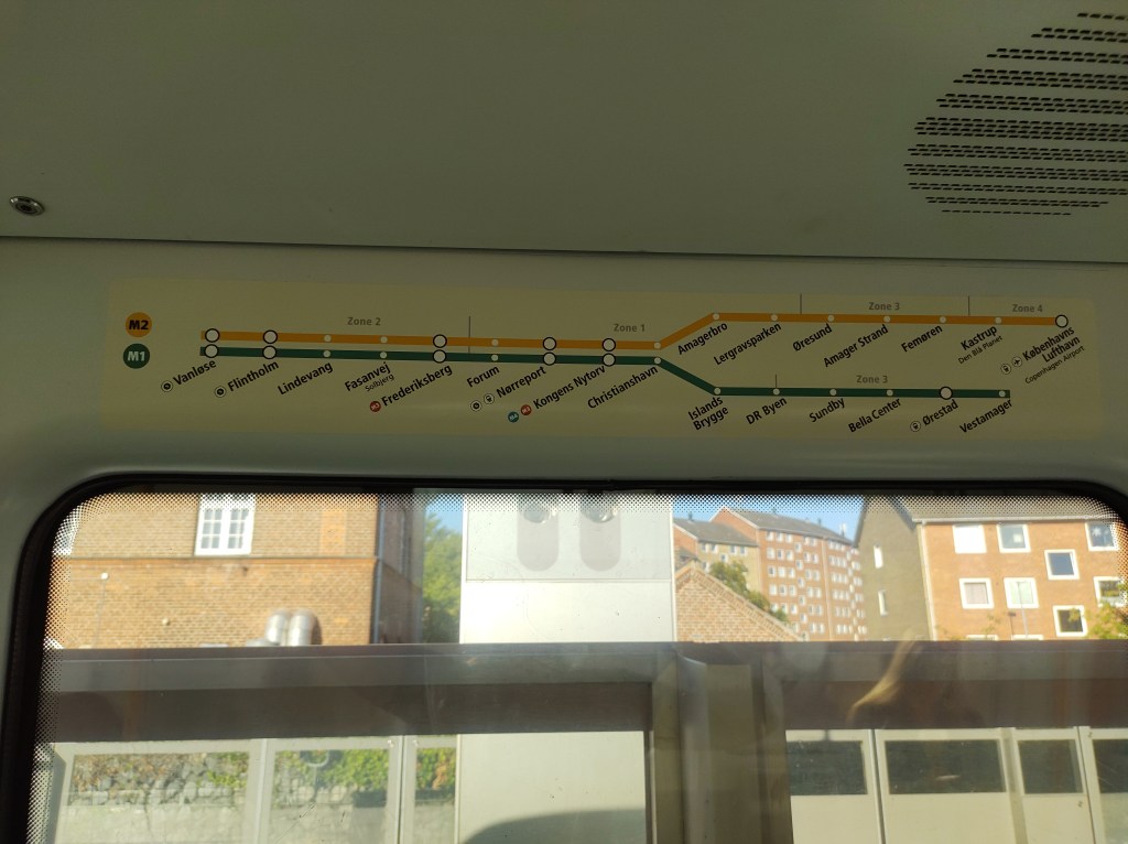 Nel caso tu volessi scendere in pieno centro, la fermata è Konges Nytorv, in questa stazione trovi anche gli scambi per la linea M3 (rossa) e M4 (blu). Tempo di percorrenza, circa dieci minuti. Per altre fermate consulta la mappa che abbiamo inserito.