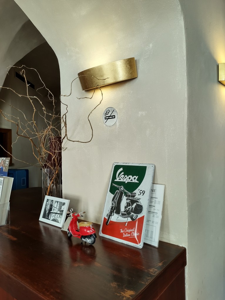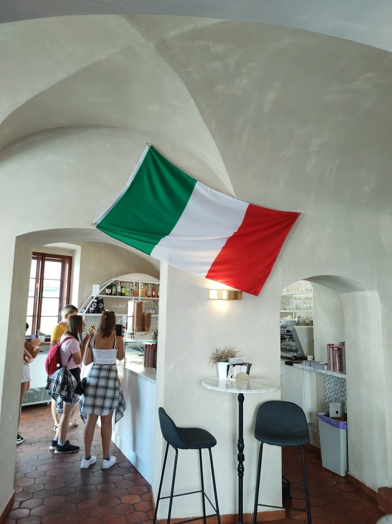 Parliamo ora dell’arredamento. Ricco di oggetti che richiamano il nostro paese e con una bandiera tricolore appesa in bella mostra, entrando, sembra di ritrovarsi per un attimo a casa. Sedersi al tavolo a bere il caffè oppure mangiare un gustoso gelato è sicuramente più che piacevole.