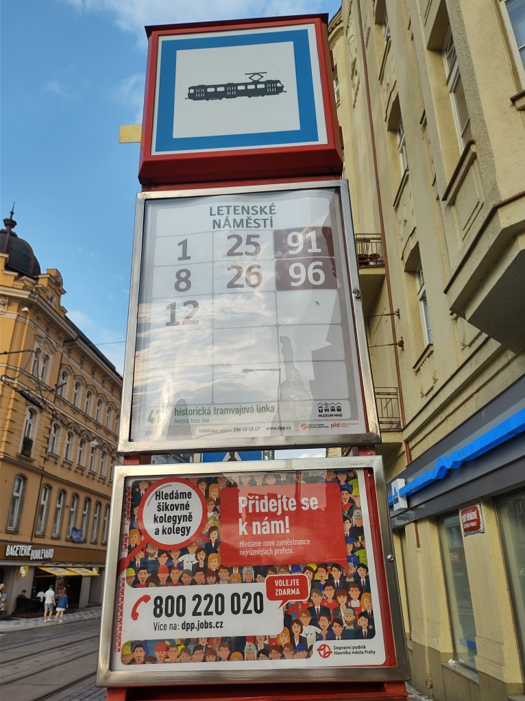 Se sei in pieno centro storico, ti suggeriamo di recarti a Namesti Republiky e rimanendo dalla parte del centro commerciale Palladium, predi via Na Porici. Appena prendi la via, trovi la fermata del tram.