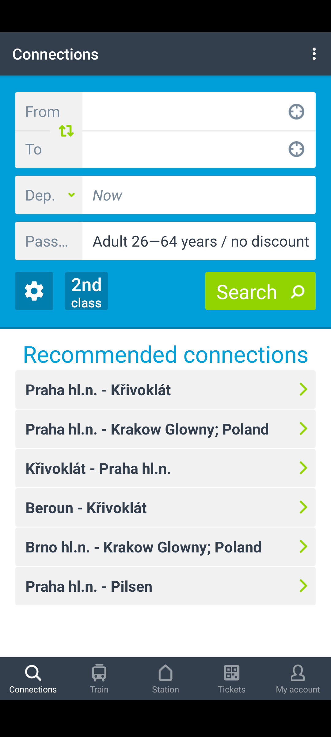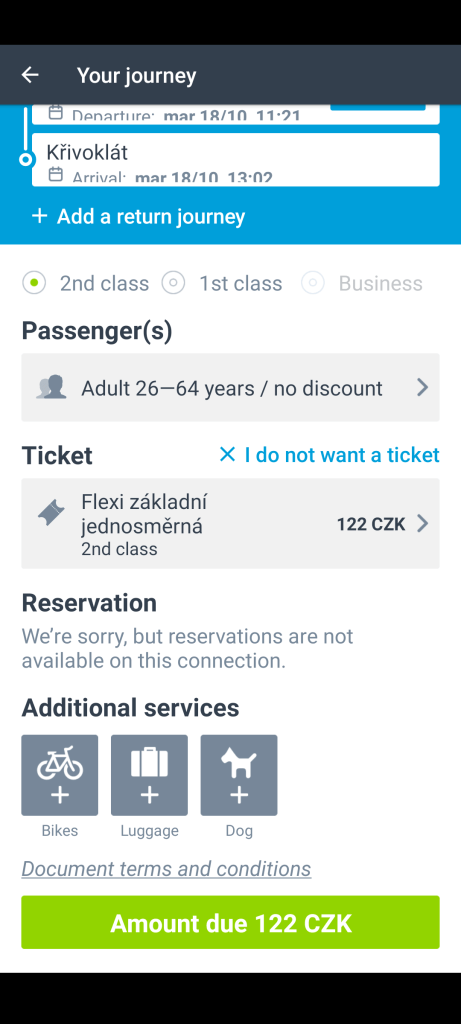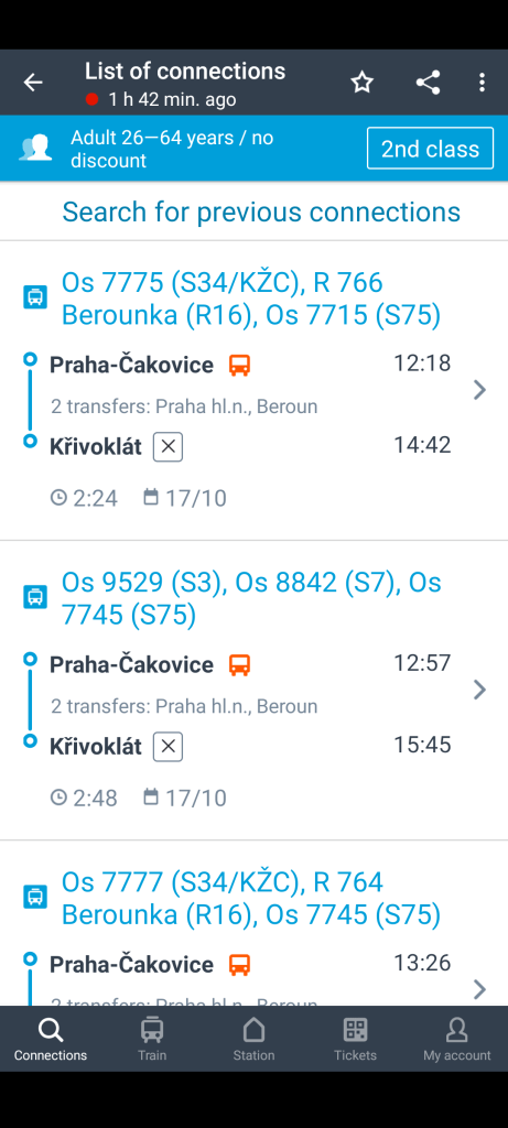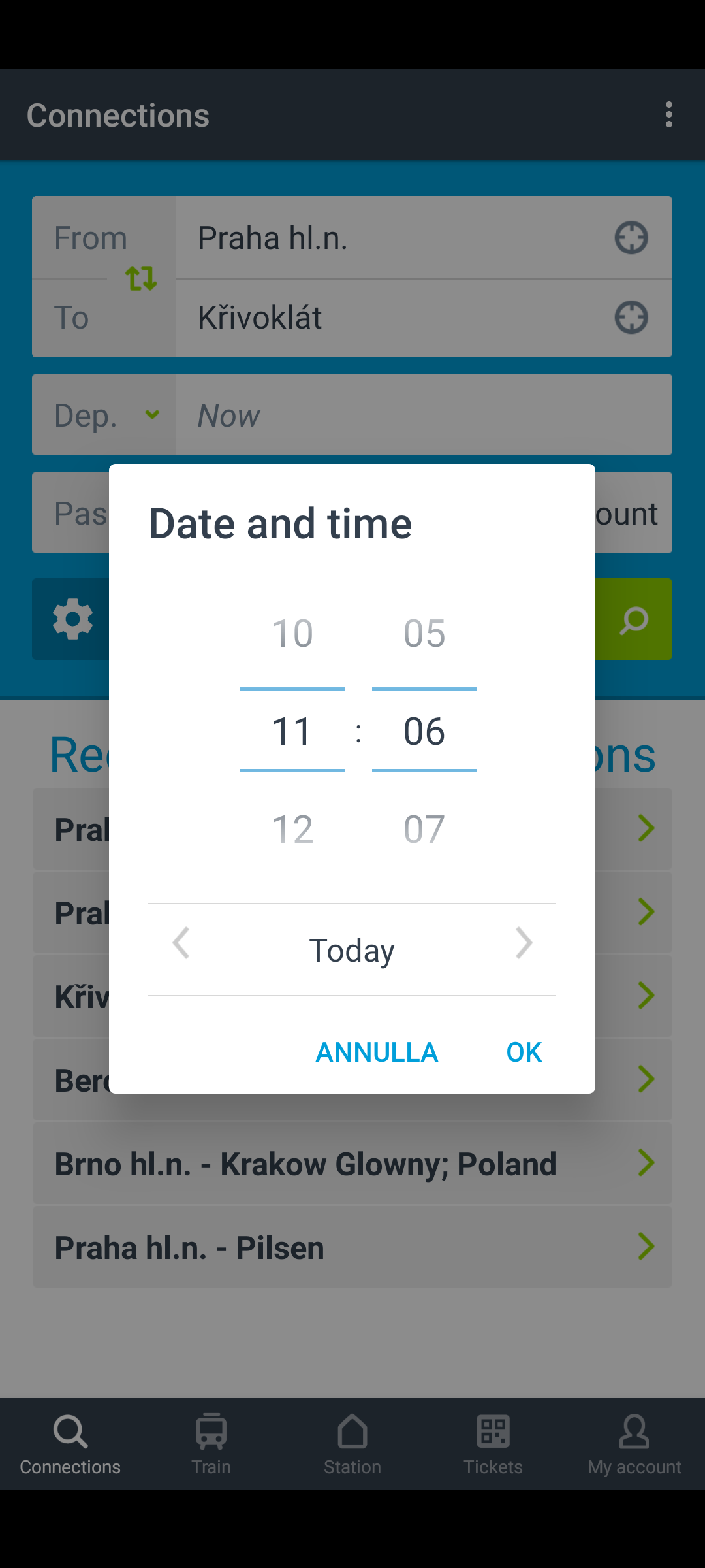 Nella schermata connections alla voce “from” inserisci la stazione di partenza, in questo caso compila il campo con “Praha hl.n.”, nel tab “To” inserisci “Křivoklát”. La parte dove vedi scritto “Dep” riguarda il giorno e l’ora della partenza, seleziona quello che preferisci e premi ok. Il tab “Pass” riguarda i passeggeri, vedi foto.