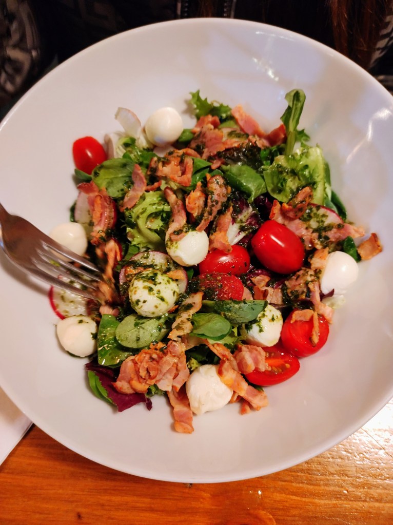 Con un piatto di penne alle verdure (se sei vegetariano chiedi al cameriere di togliere il pollo) e con un’insalata mista con mozzarella di bufala (chiedi di togliere bacon).