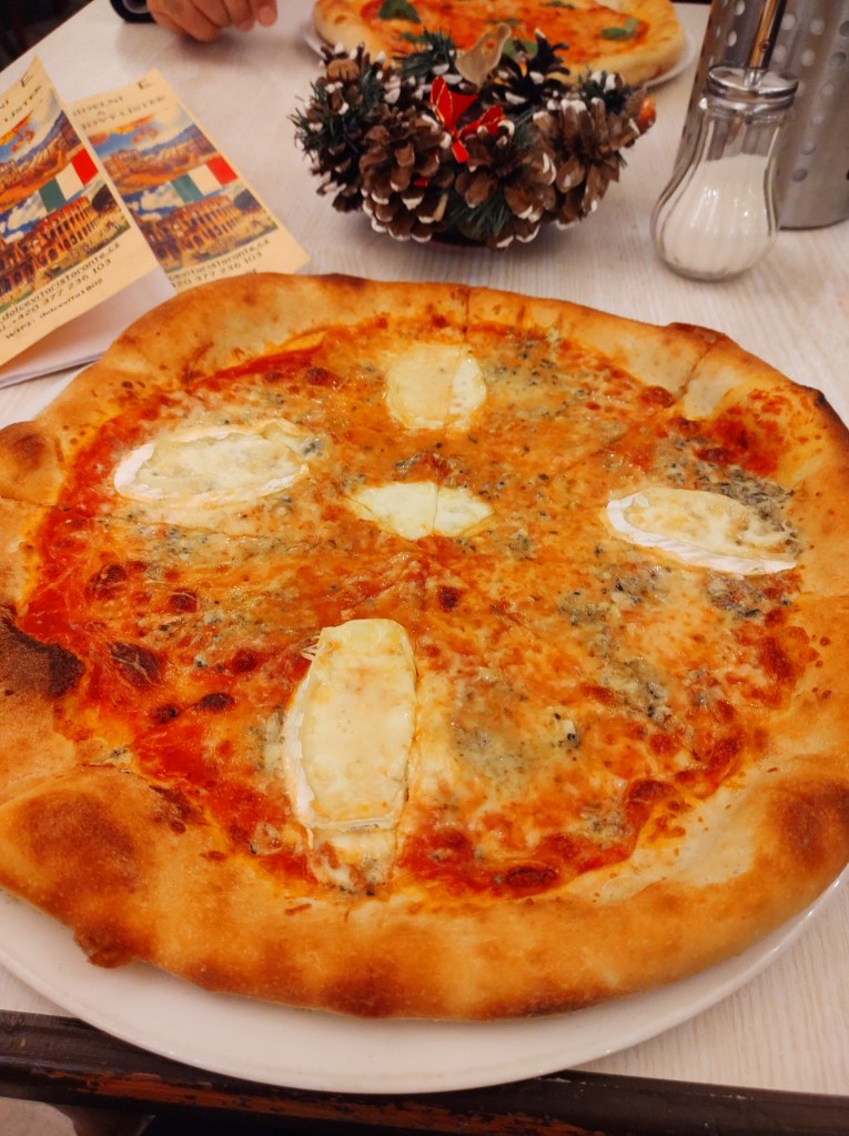 Cosa abbiamo assaggiato noi? Essendo vegetariani abbiamo ordinato una zuppa all’aglio, una pizza margherita e una ai quattro formaggi.