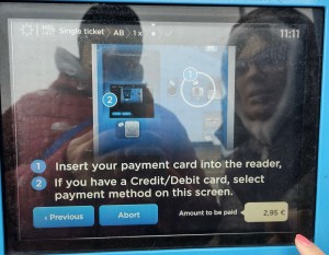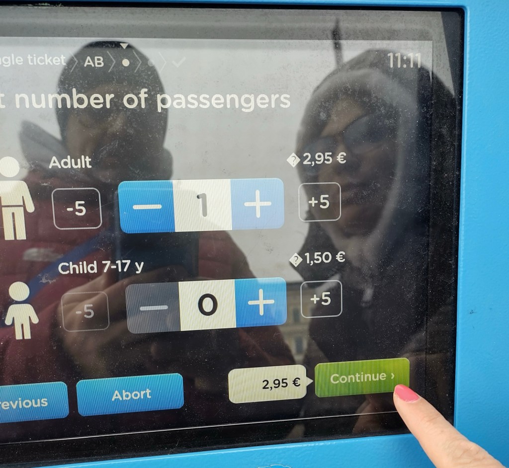 Alla schermata successiva, seleziona il numero di biglietti. Costo per corsa singola 2,95 €. Bambini da 7 a 17 anni di età, la tariffa è ridotta. Selezionato i biglietti e premi su “continue” (il tab, da grigio, ora, dovrebbe essere di colore verde).