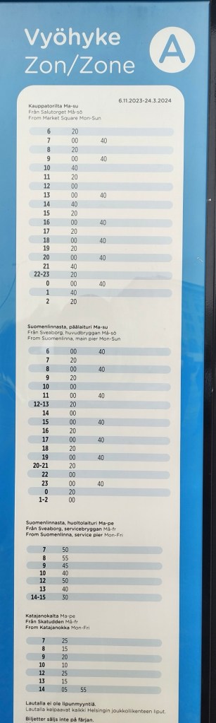 Se durante la tua visita a Helsinki hai acquistato un abbonamento per prendere i mezzi pubblici che comprende le zone (AB, ABC o ABCD), potrai utilizzarlo per salire sul traghetto, Suomenlinna si trova nella zona A, pertanto, l’abbonamento sarà valido.