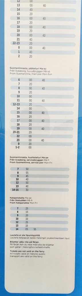 L’Autorità regionale dei trasporti di Helsinki, è responsabile del traffico dei traghetti. Ogni giorno, i battelli effettuano da 1 a 4 corse all’ora, dalla mattina alla sera tutto l’anno.