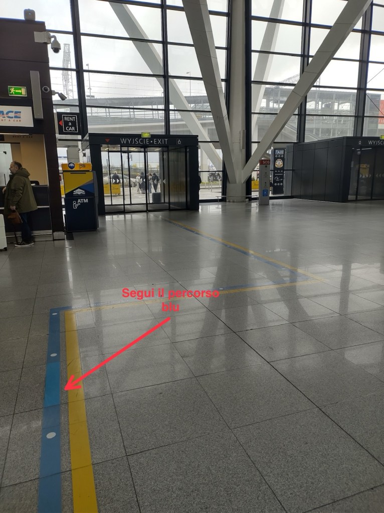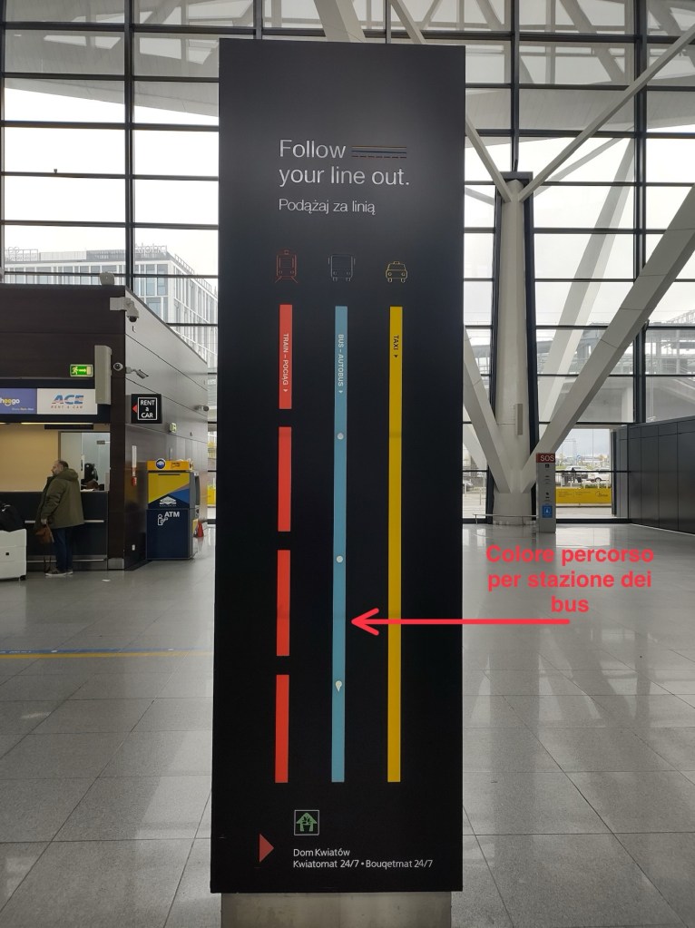 Quando arriverai all’aeroporto di Danzica, una volta lasciata l’aerea recupero bagagli, proprio davanti alla porta d’uscita, troverai un grande cartello che riporta i tre servizi che si hanno a disposizione per andare via. Linea rossa “treno”, linea blu “bus” e linea gialla “taxi”.