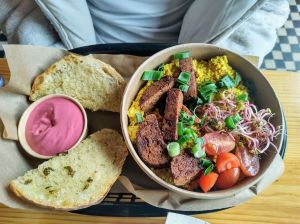Lo Scrambled tofu, riprende le classiche uova strapazzate. Il tofu viene accompagnato con dei crostini, pomodori, insalata, due fette di pane e una salsa di rapa rossa. Il sapora, credici, è eccezionale. Un piatto tutto da assaggiare.