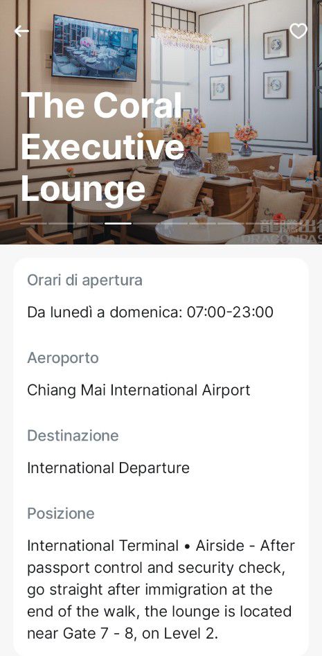 Ricapitolando: la The Coral Executive Lounge la puoi trovare alle partenze internazionali dell’aeroporto di Chiang Mai, subito dopo il controllo passaporti. È aperta tutti i giorni dalle 7:00 alle 23:00 e potrai entrare senza nessun problema con il tuo Dragonpass. La sala business mette a disposizione molte cose fantastiche, come ad esempio massaggi e delizioso cibo. Attendere il proprio volo nella lounge ti garantisce di affrontare il viaggio in modo completamente diverso. Basta con le lunghe attese su poltrone scomode e spesso sporche, procurati un Dragonpass e dai inizio a un nuovo modo di viaggiare.