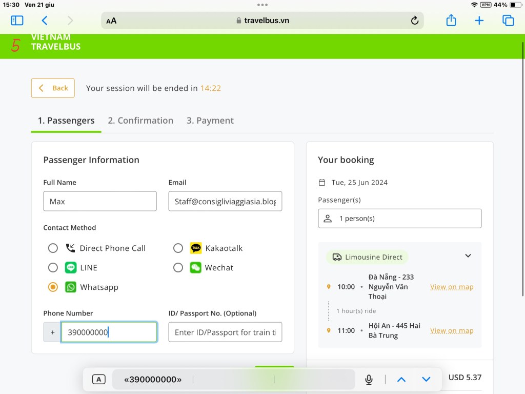 In “Full name” inserisci il tuo nome e cognome. In “Email” inserisci il tuo indirizzo di posta elettronica dove desideri ricevere i biglietti. In “Contact method” spunta il servizio che preferisci, sicuramente sarà Whatsapp. In “Phone Number”, riporta, compreso di prefisso internazionale, il tuo numero Whatsapp. “ID passport” puoi lasciarlo in bianco. Una volta compilati tutti i campi, premi su “Next” e passa alla pagina seguente, ma prima di farlo, leggi attentamente il riepilogo che vedi sulla destra del monitor.