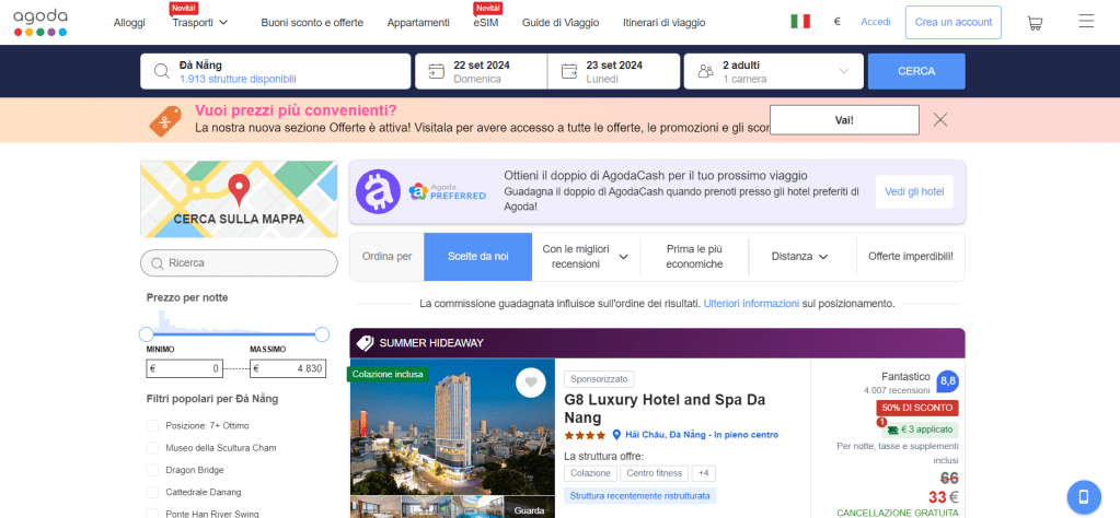 La pagina si aprirà con le strutture scelte e suggerite da AGODA, ma grazie ai filtri “ordina per”, “Con le migliori recensioni” ecc… potrai visualizzarla come meglio credi.