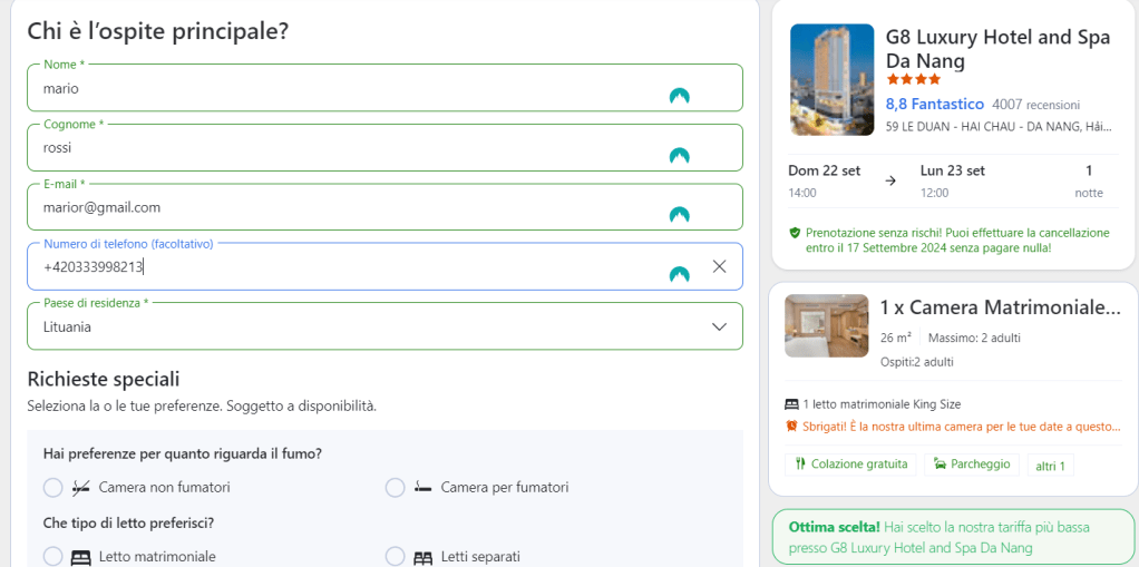 Nella schermata che ti si aprirà, non dovrai far altro che compilare i campi con i tuoi dati: nome, cognome, email, numero di telefono e paese di residenza. Volendo, potrai inserire anche “richieste speciali” come letti separati, camera per fumatori, ecc…