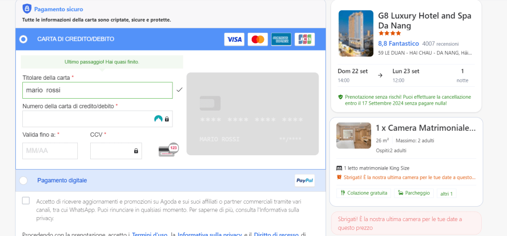 Come hai potuto vedere, effettuare una prenotazione su AGODA è piuttosto semplice. Come su altri siti web simili, le cose a cui dovrai prestare attenzione sono: il metodo di pagamento, se dovrai pagare in anticipo o no, la cancellazione gratuita, le recensioni lasciate dagli altri clienti, i servizi scelti e soprattutto, quali sono le clausole nel caso di una imprevista cancellazione qualche giorno prima dell’arrivo.