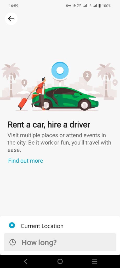 Nella schermata con la scritta “Rent a car, hire a driver”, dovrai, come prima cosa, segnalare la tua posizione. Questo servirà all’autista per venirti a prendere. Clicca su “Current Location”, seleziona la posizione e torna alla precedente immagine.