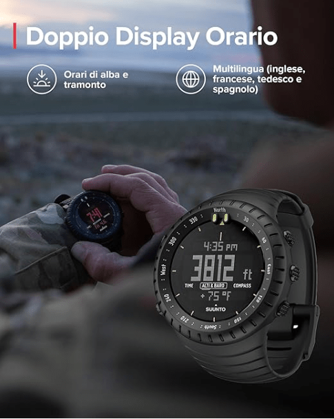 Il Suunto Core è, senza dubbio, l’orologio che la maggior parte degli amanti dell’outdoor vorrebbe avere al polso. Questo orologio sportivo racchiude tutte le funzioni principali necessarie per le attività all’aria aperta. Grazie al suo comodo cinturino in elastomero e alla sua struttura resistente, è uno dei migliori orologi per attività outdoor che puoi trovare in commercio a un prezzo medio-alto.