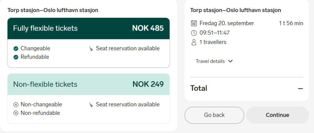 In questa pagina, dovrai scegliere il treno che intendi prendere. Come puoi vedere, il costo del biglietto è di 249 NOK, circa €21,00.