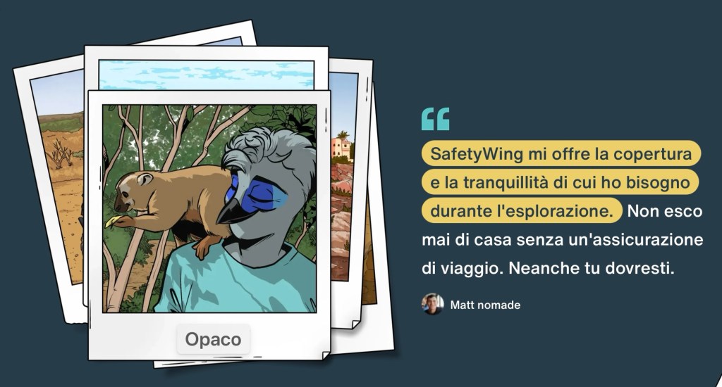 Io, durante i miei viaggi, soprattutto quelli che durano da tre a quattro settimane, attivo sempre SafetyWing. Ne hai mai sentito parlare? Se non la conosci, beh, sappi che è una delle migliori assicurazioni in circolazione, soprattutto per chi è un nomade digitale. Ma non lasciarti ingannare dal nome, anche se non sei un nomade digitale, potrai attivarla tranquillamente.