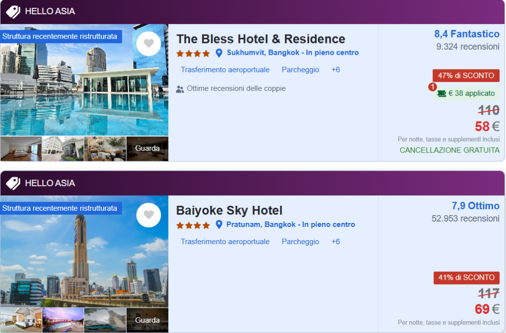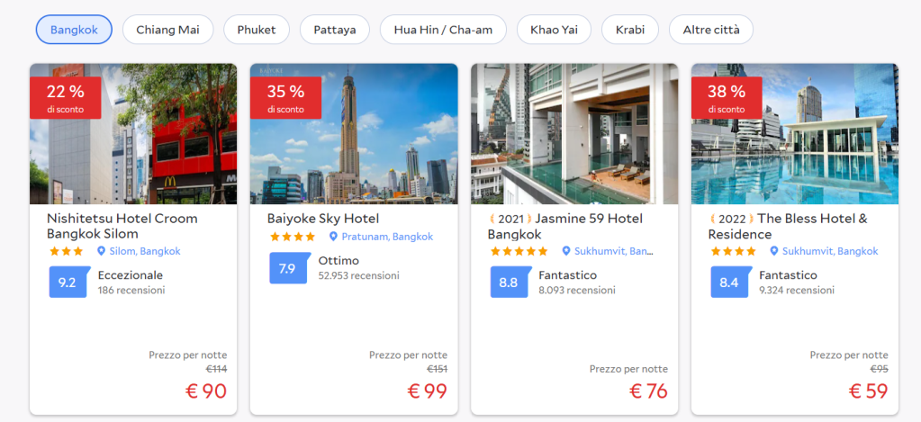 Mettendo come destinazione la Thailandia e, inserendo come data per il soggiorno dal 13 gennaio al 20 gennaio, i primi due risultati che mi vengono restituiti sono il “The Bless Hotel & Residence” a Bangkok dove posso effettuare una prenotazione con uno sconto del 47% e, il “Baiyoke Sky Hotel” sempre a Bangkok, sconto del 41%.