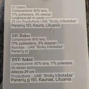 Come puoi vedere dalla fotografia che ho inserito qui sopra, i calzini sono composti per l’80% da lana, per il 17% da poliestere e per il 3% da elastan (una fibra sintetica di poliuretano utilizzata per elasticizzare i tessuti).