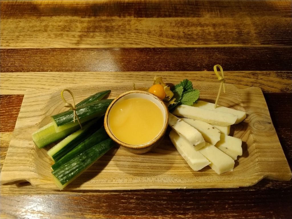 Per iniziare, abbiamo voluto assaggiare un tagliere di formaggio locale con cetriolo fresco e miele locale. Ad ogni morso, la freschezza e il sapore unico sia del formaggio che del miele hanno esaltato i nostri palati.
