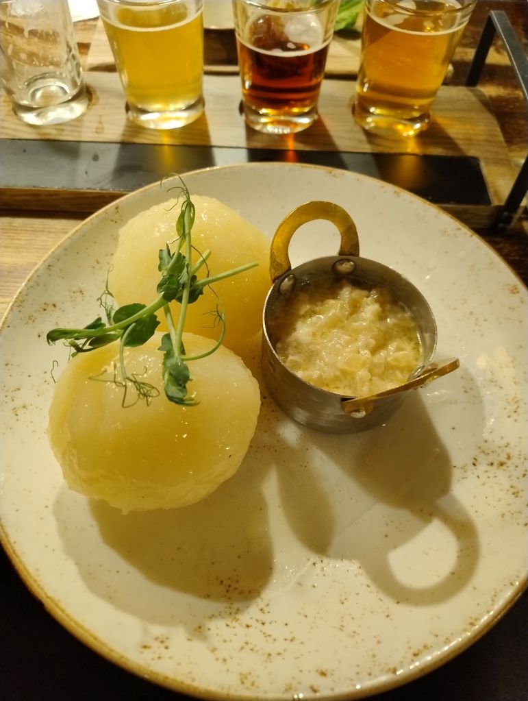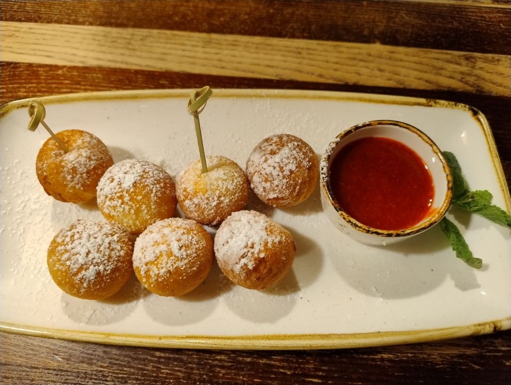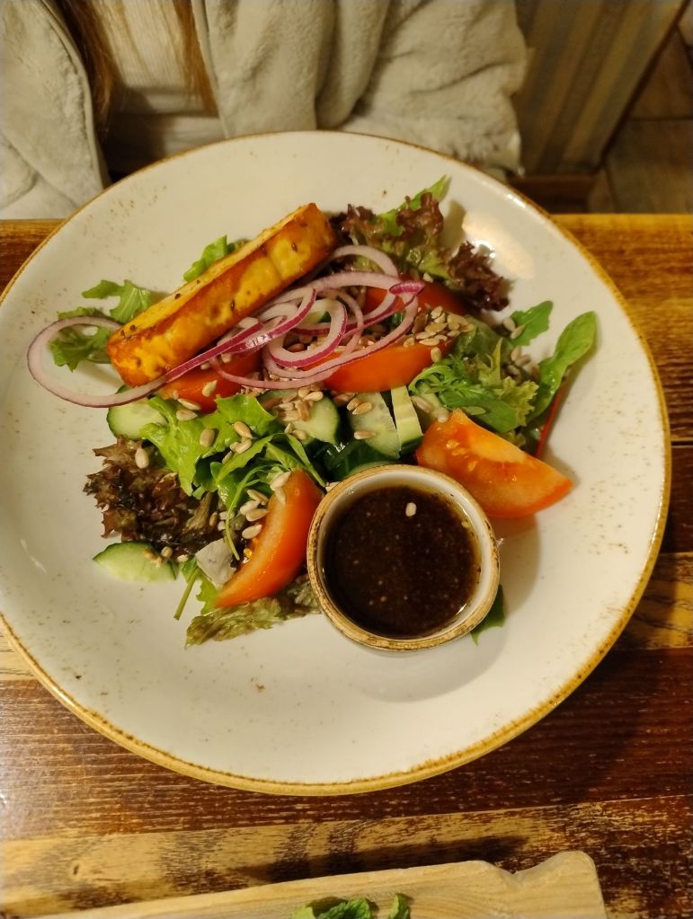 Abbiamo proseguito la nostra cena con una fresca e croccante insalata mista, accompagnata da una fetta di formaggio fritto e un piatto di Cepelinai farciti sempre di formaggio, il tutto accompagnato da una delicata salsa di cipolle dolci. Entrambi i piatti ci hanno sorpreso. Freschi, gustosi e abbondanti, li abbiamo trovati molto leggeri, cucinati a regola d’arte e gustosi.
