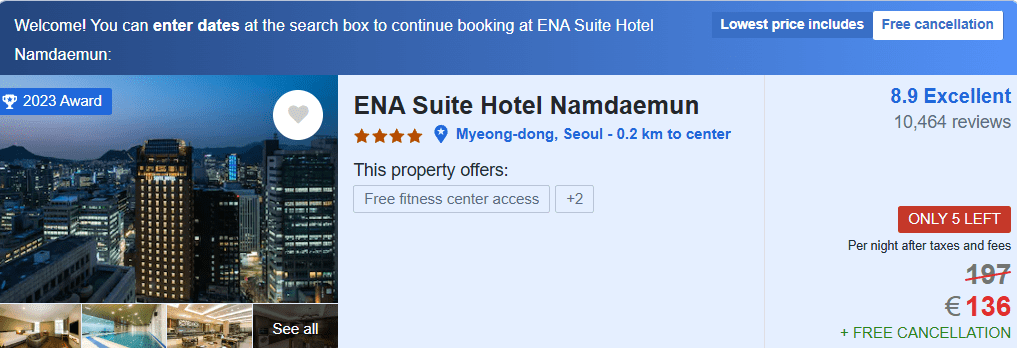 Se stai cercando un hotel a Seoul che ti permetta di godere di un’atmosfera rilassante e accogliente, con un servizio di qualità e una posizione comoda per visitare le principali attrazioni, l’ENA Suite Hotel è la scelta perfetta. Da qui, potrai facilmente raggiungere il Palazzo Reale, la famosa via dello shopping, il Mercato di Namdaemun e la suggestiva Porta Sungnyemun, oltre a molte altre meraviglie.