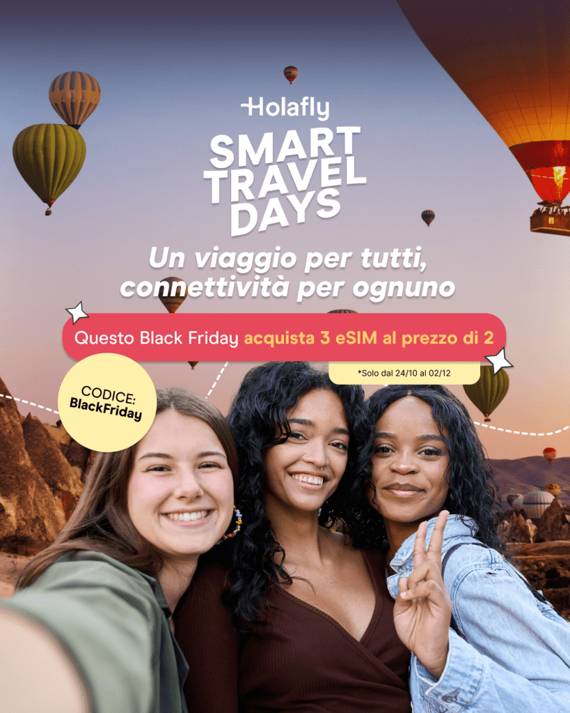 Durante gli Smart Travel Days, infatti, potete ottenere 3 eSIM al prezzo di 2 usando il codice BLACKFRIDAY. Una promo che non vuole sembrare un classico “3×2”, ma un invito a viaggiare in modo più intelligente, sereno e condiviso.