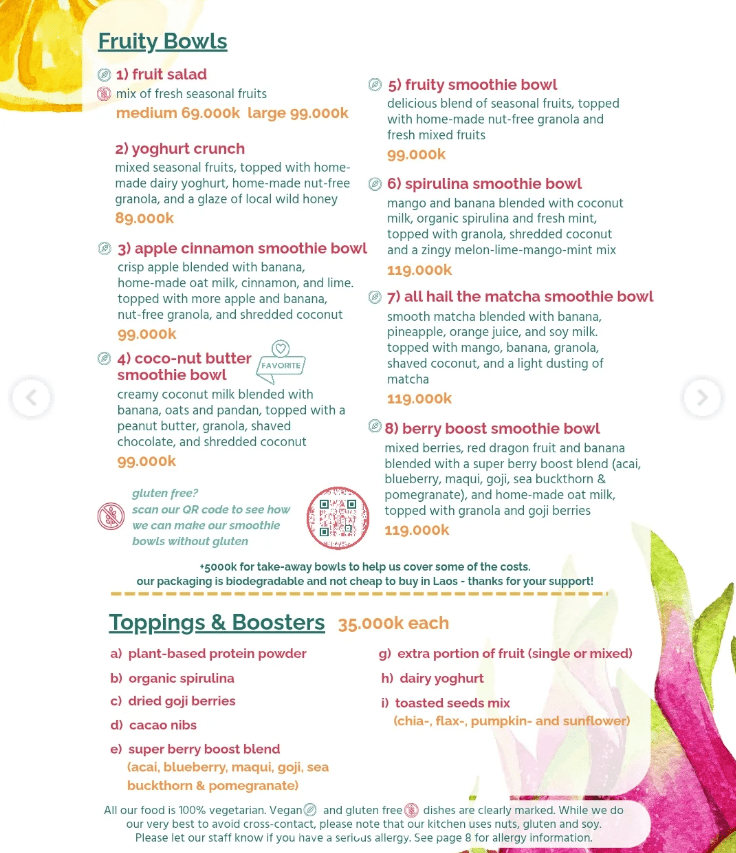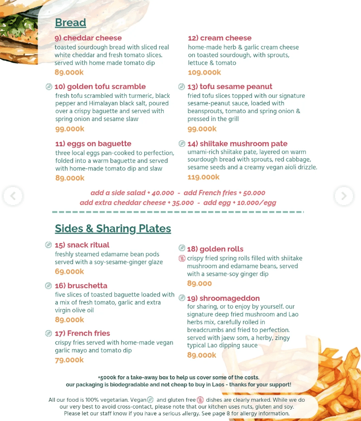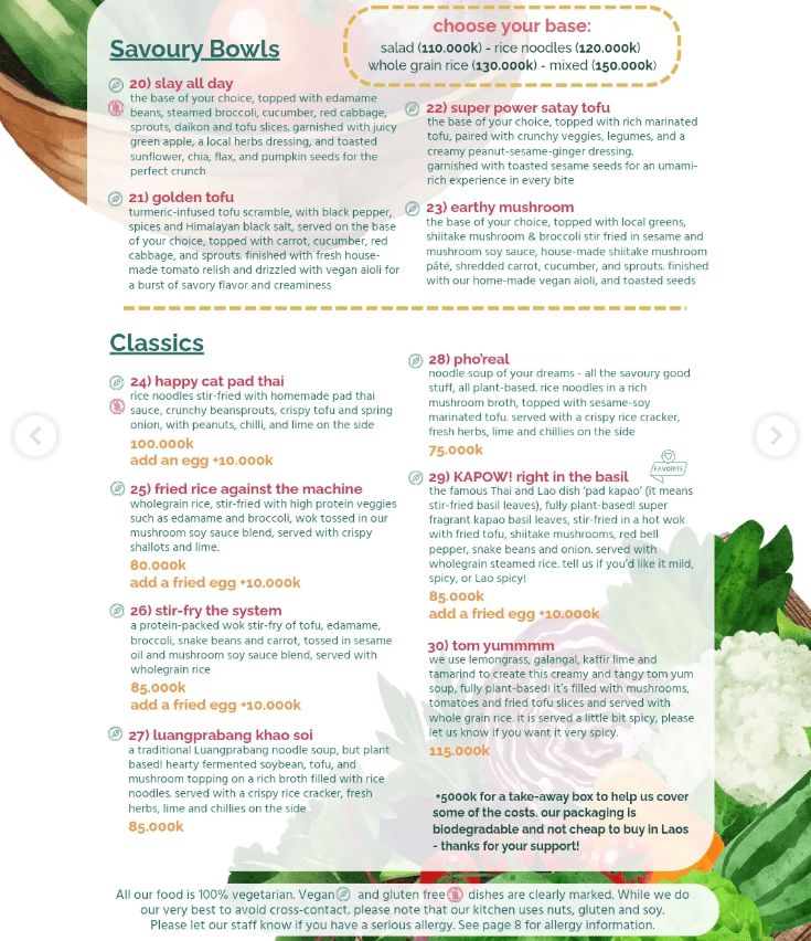 The Happy Cat – o “The Happy Cat Luangprabang Veggie Café‑Restaurant” – è un ristorante vegetariano con una forte impronta plant‑based. Non è completamente vegano, ma oltre l’80% del menu può essere reso vegano senza sovrapprezzo. Lo staff è abituato a richieste specifiche e ti aiuta volentieri.