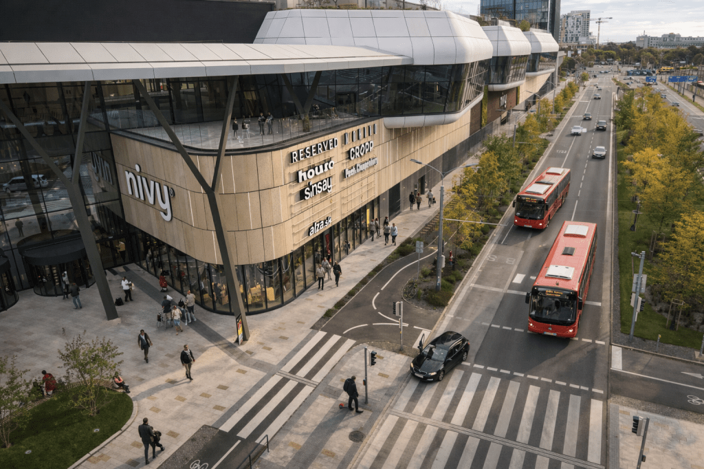 Il bus arriva alla stazione Mlynské Nivy, situata al piano inferiore del moderno centro commerciale Nivy Centrum. È una posizione strategica per: